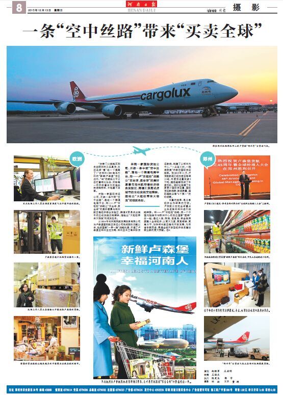 在8次報(bào)道中,既有會(huì)前的“熱身”宣傳,又有會(huì)中的集中點(diǎn)擊,還有會(huì)后的回顧追蹤,形成系列,精彩紛呈。13日,《河南日?qǐng)?bào)》以圖文并茂的整版篇幅,對(duì)河南航投與盧貨航的合作,尤其是“新鮮盧森堡”雙向跨境E貿(mào)易進(jìn)行了詳細(xì)報(bào)道。整個(gè)報(bào)道以新聞攝影為主,既有盧貨航“鄭州號(hào)”波音747-8F全貨機(jī),也有鄭-盧航線的專業(yè)操作流程展示,還有河南百姓采購(gòu)“新鮮盧森堡”商品的真實(shí)場(chǎng)景……以鄭盧“雙樞紐”為典型案例,圍繞“一條‘空中絲路’帶來(lái)‘買賣全球’”這一主題,生動(dòng)展現(xiàn)了河南省依靠藍(lán)天對(duì)外開放的新思路和新成就。